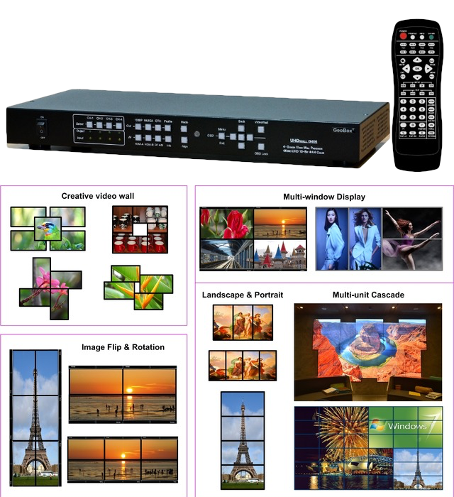Le G406 est conçu avec une fonction de commutation matricielle pour afficher 1, 2, 3 ou 4 contenus indépendants sur quatre murs vidéo LCD. Deux ports de boucle HDMI 2.0 sont conçus pour la cascade de plusieurs unités et permettent à l'utilisateur de sélectionner différents contenus pour le mur vidéo entier.